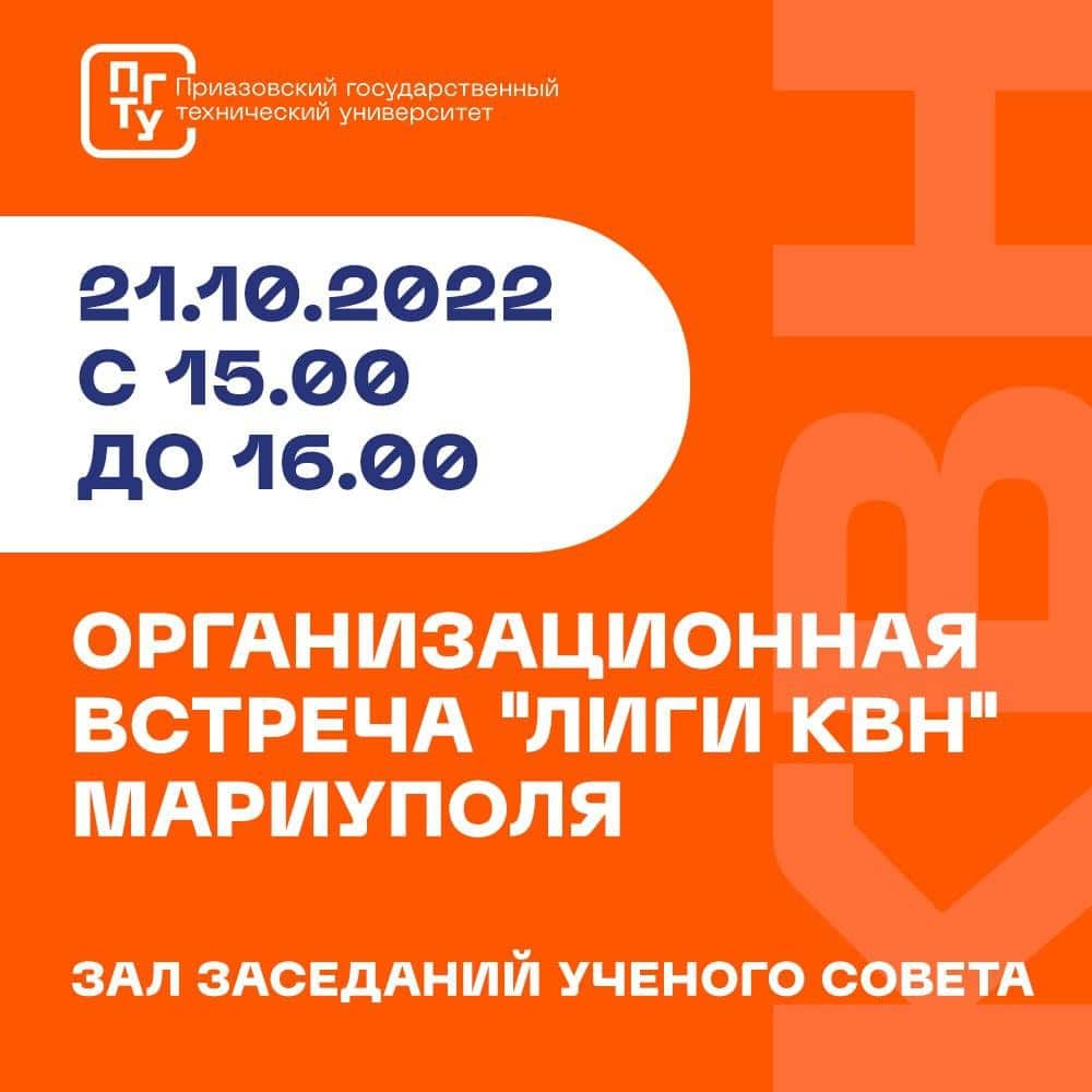 21.10.2022 с 15.00 до 16.00 в ГВУЗ "ПГТУ" состоится ознакомительная встреча с командами КВН университетов Мариуполя и представителями администрации нашего города для создания в дальнейшем студенческой лиги КВН.