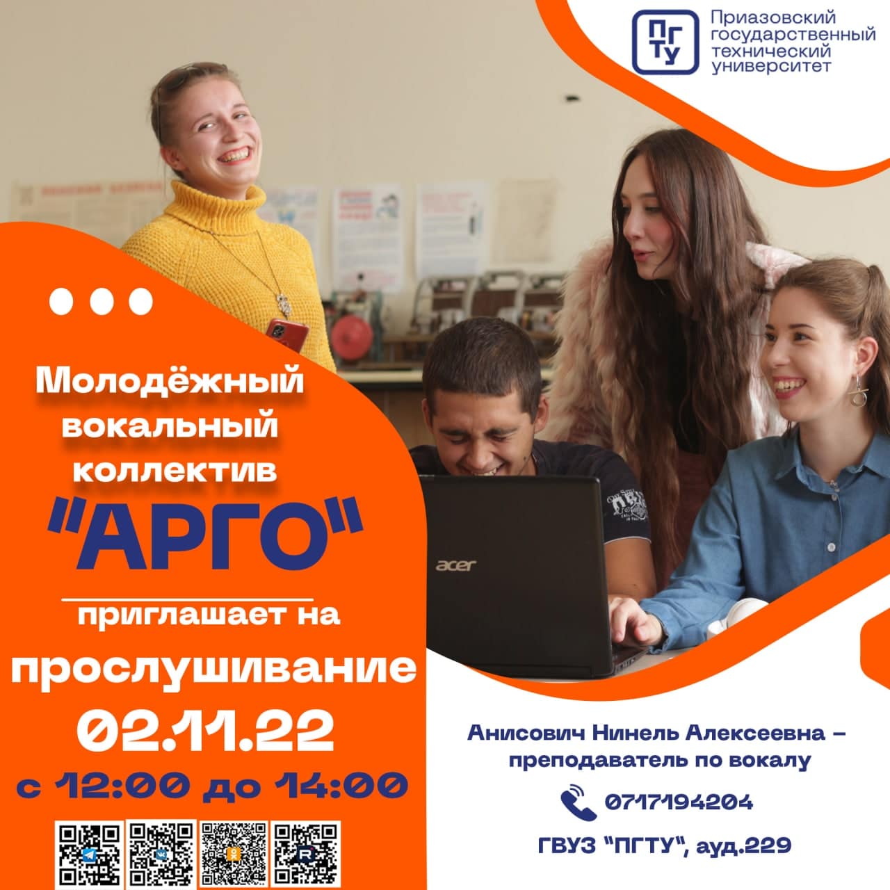 Молодежный вокальный коллектив "Арго" приглашает студентов на прослушивание.