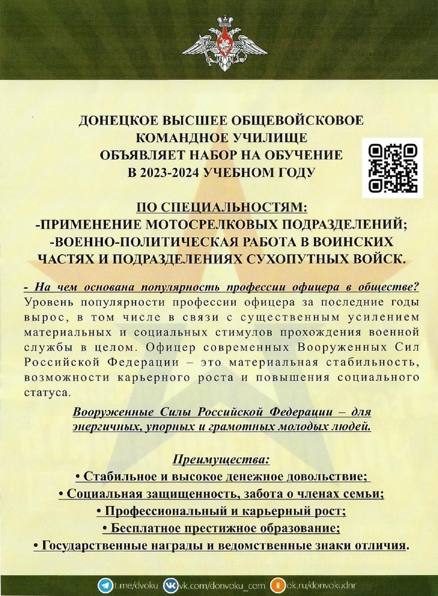 Донецкое высшее общевойсковое командное училище объявляет набор на обучение в 2023-2024 учебном году!
